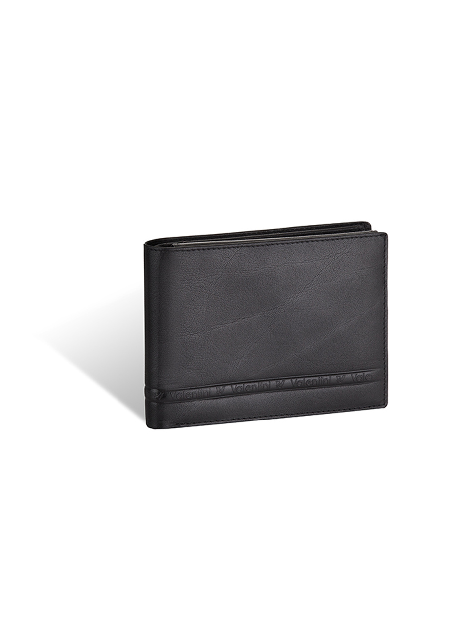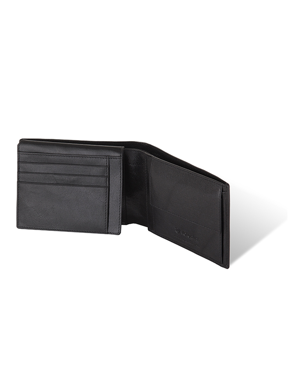 - Czarny, skórzany portfel z zakładką, miejscami na karty i ochroną RFID.