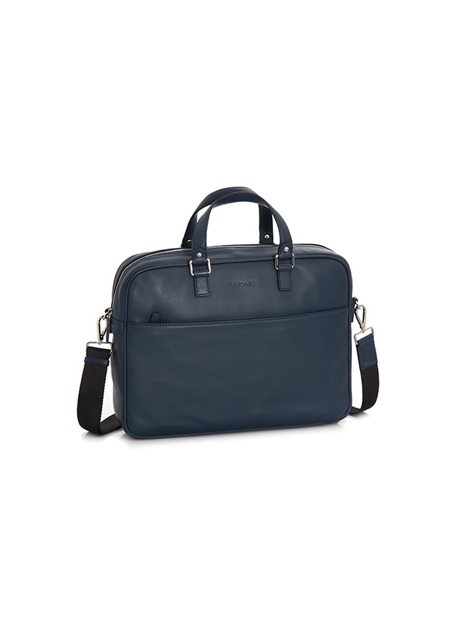 - Granatowa, elegancka teczka z przegrodą, długim paskiem i organizerem.