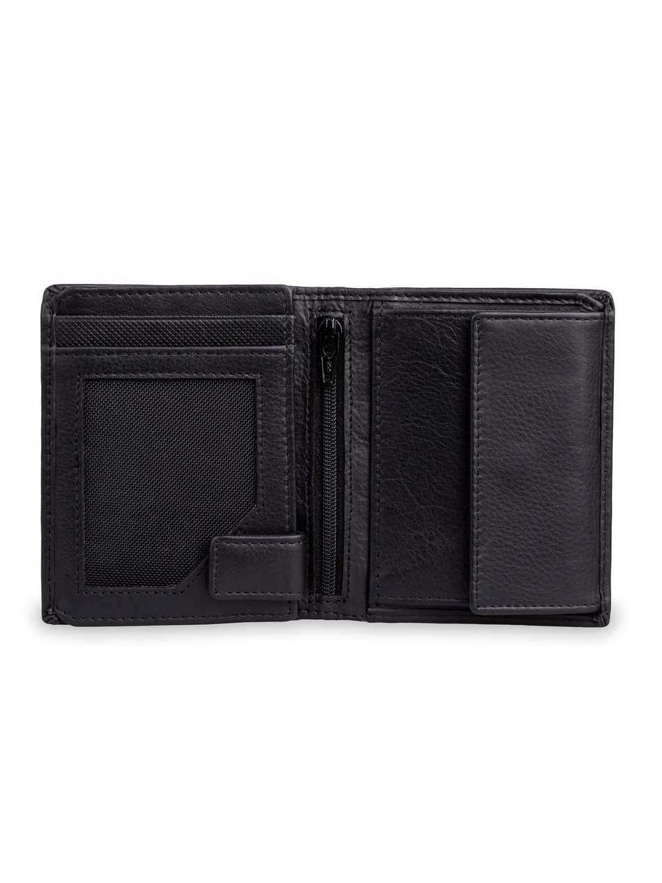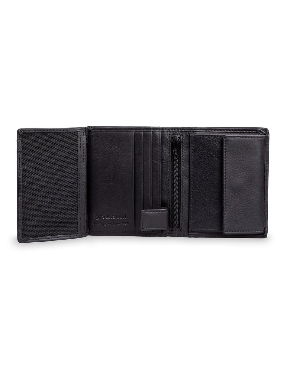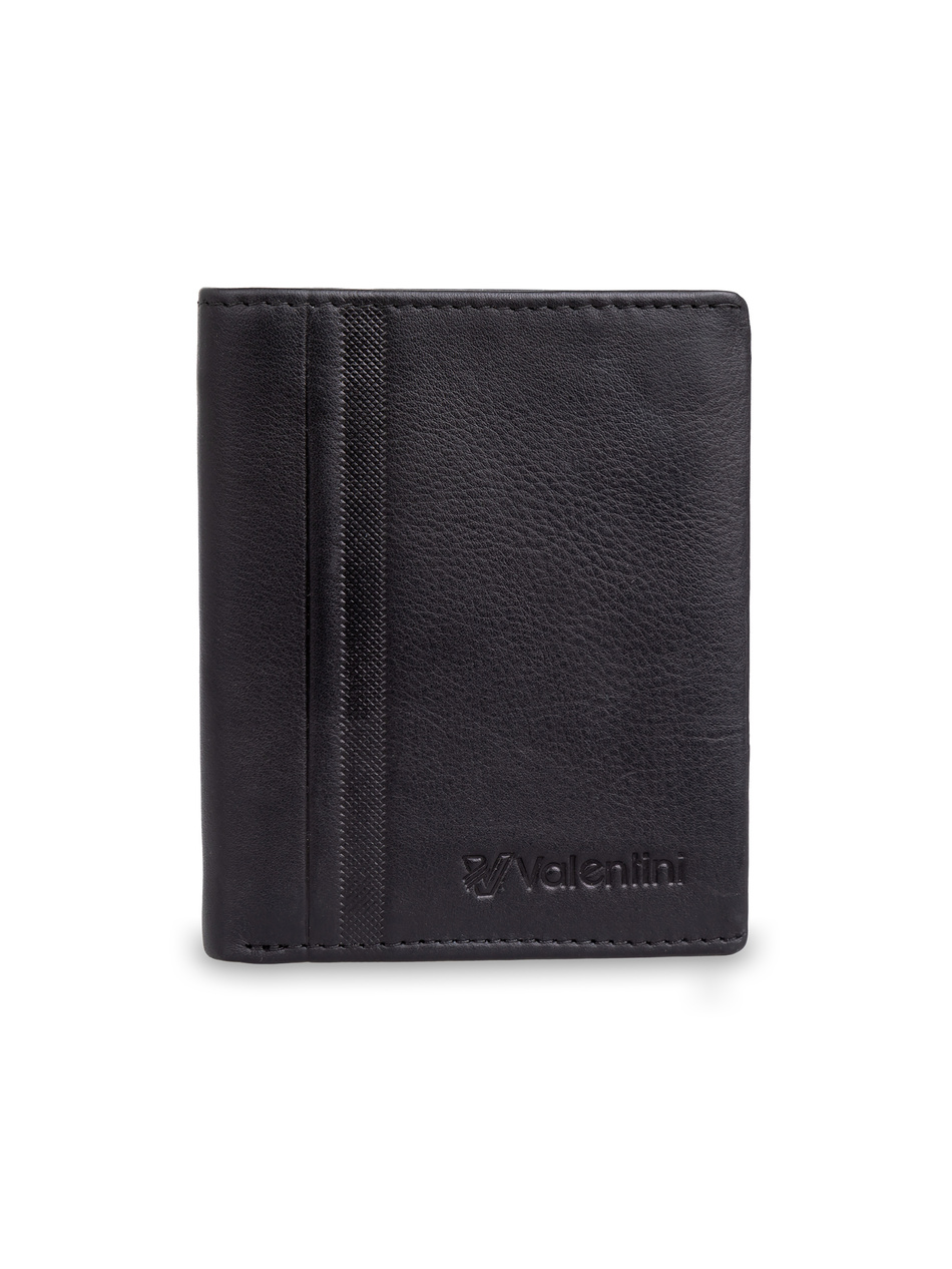 Męski portfel o układzie pionowym z kolekcji Trophy od Valentini wymiarów: 8,5 x 10,5 cm. Wewnątrz produkt posiada 3 miejsca na dokumenty, 5 na karty oraz kieszeń na bilon zamykaną na zatrzask. Na froncie znajduje się wytłoczone logo Valentini oraz fakturowany pasek – całość jest klasyczna, ponadczasowa a zarazem elegancka. Portfel został wykonany z wysokiej jakości skóry naturalnej.