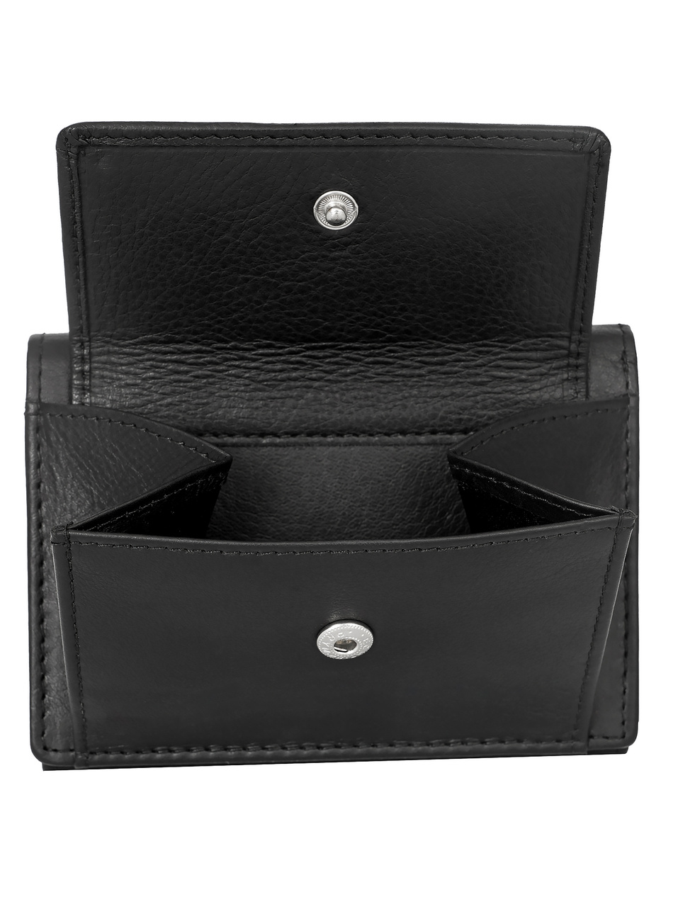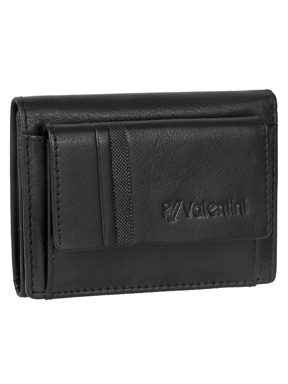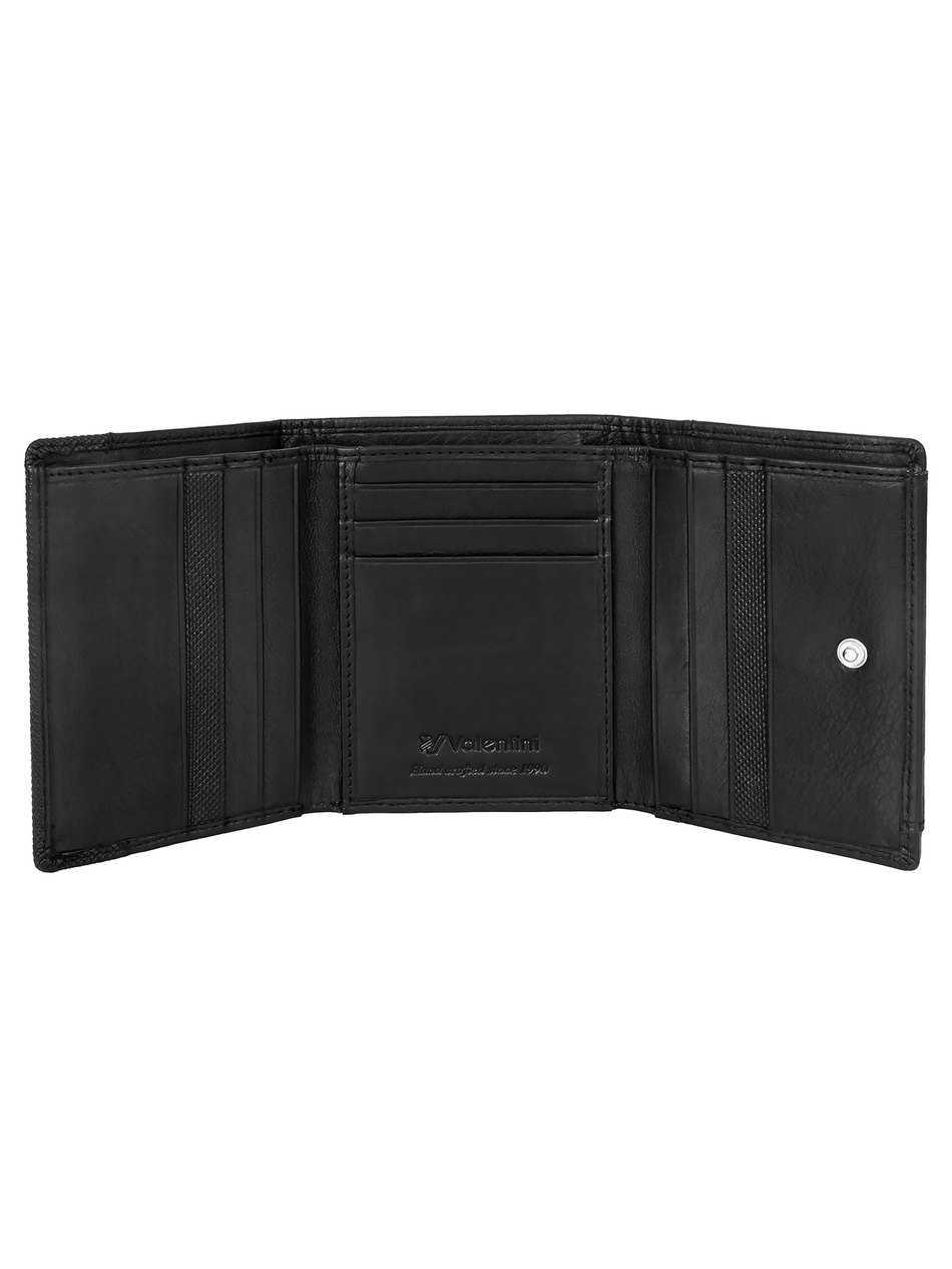 Skórzany portfel męski z kolekcji Trophy od Valentini w kolorze czarnym o wymiarach 10,5 x 8,5 cm. Produkt posiada 9 miejsc na karty, 3 miejsca na dokumenty, przegrodę na banknoty. Jest też wyposażony w zapinane na zatrzask miejsce na bilon. Portfel jest wykończony z najwyższą starannością, w klasycznym odcieniu czerni. Na froncie portfela znajduje się wytłoczone logo Valentini oraz fakturowany pasek – całość jest ponadczasowa i elegancka. Portfel został wykonany z wysokiej jakości skóry naturalnej.
