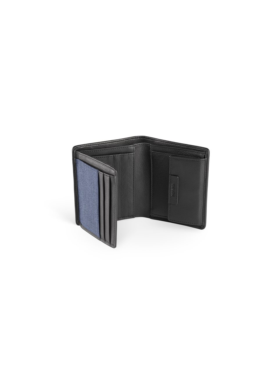 - Pionowy portfel męski wykonany z połączenia dwóch materiałów: czarnej skóry naturalnej i granatowego płótna.
