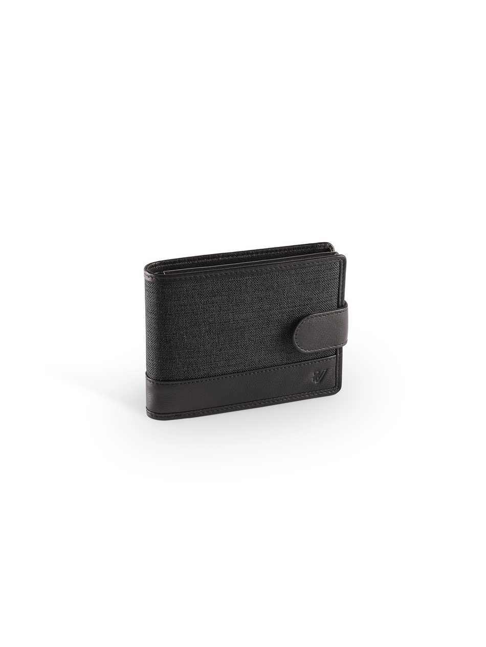 - Poziomy portfel męski wykonany z połączenia dwóch materiałów: skóry naturalnej i płótna.