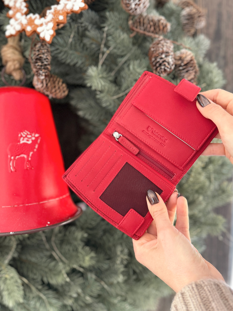 Kolekcja skórzanych portfeli Milford marki Valentini to propozycja klasycznych portfeli. Modele damskie i męskie wykonano z miękkiej cielęcej skóry o lekko widocznej strukturze. Portfele są bardzo lekkie i elastyczne, dzięki czemu nawet wypełnione zachowują elegancki charakter. Polecamy Państwa uwadze portfel damski zapinany na zatrzask o orientacji poziomej w wymiarach 13 x 10 cm. Wnętrze obszyte jest wysokiej jakości miękką skórą cielęcą, na froncie portfel posiada zdobienie w postaci logo Valentini wytłoczonego w skórze oraz poziome zdobienie nadające mu wyjątkowego charakteru. Ten wyjątkowy model posiada 2 miejsca na banknoty, 7 miejsc na karty kredytowe oraz 6 miejsca na dokumenty, dodatkowo kieszonkę na bilon zapinaną na zatrzask. Optymalny rozmiar oraz perfekcyjna konstrukcja portfela zadowoli każdą kobietę, doskonale sprawdzi się również jako prezent.Wymiary WięcejPodane wymiary uwzględniają wystające elementy jak rączki i kółka. Wymiary podane są w kolejności szerokość x wysokość x głębokość cm.