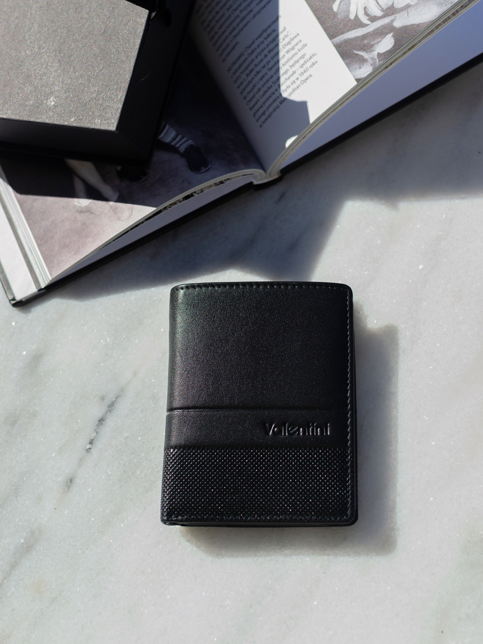 Ten męski portfel skórzany bez kieszonki na monety to elegancka propozycja dla osób ceniących minimalistyczny styl i wysoką jakość. Wykonany z gładkiej, czarnej skóry, portfel łączy prosty design z subtelnym, teksturowanym wykończeniem w dolnej części, co nadaje mu wyjątkowego charakteru. Klasyczna czerń sprawia, że doskonale pasuje do każdej stylizacji, od casualowej po formalną. Portfel oferuje funkcjonalne rozwiązania w postaci licznych przegródek na karty, co ułatwia organizację i przechowywanie niezbędnych dokumentów. Dodatkowo, okienko na dokument tożsamości lub zdjęcie zwiększa wygodę użytkowania. To idealny wybór dla mężczyzn, którzy preferują elegancki, ale praktyczny dodatek na co dzień.